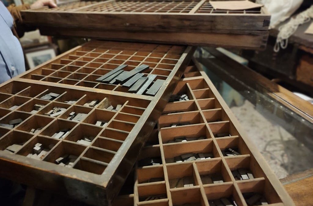 Με τα μεταλλικά τυπογραφικά στοιχεία να συνθέτεις γράμμα – γράμμα τις λέξεις.