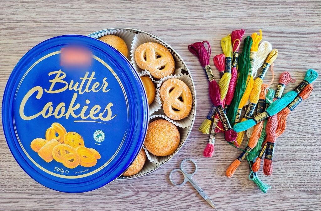 Αργότερα που μπήκα στην εφηβεία, πήρα προαγωγή και ανέβηκα επίπεδο, σε ύφασμα άιντα και κλωστές DMC. Αν καμιά φορά μου έλειπαν χρώματα για να ολοκληρώσω το σχέδιο του κεντήματος, έπαιρνα από το απόθεμα της μητέρας μου που φυλούσε τις δικές της κλωστές σε κάποιο στρογγυλό μεταλλικό κουτί από βουτήματα βουτύρου.